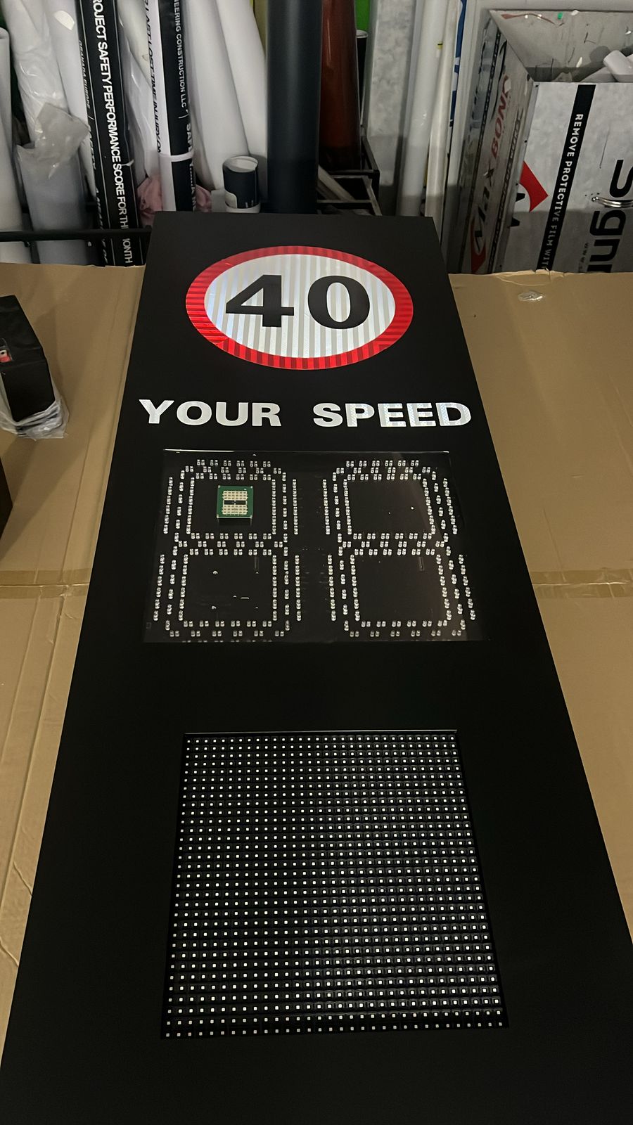 Speed Display: The vehicle’s speed is displayed on the LED sign. If the vehicle is within the speed limit, a green number and a green smiley face appear.